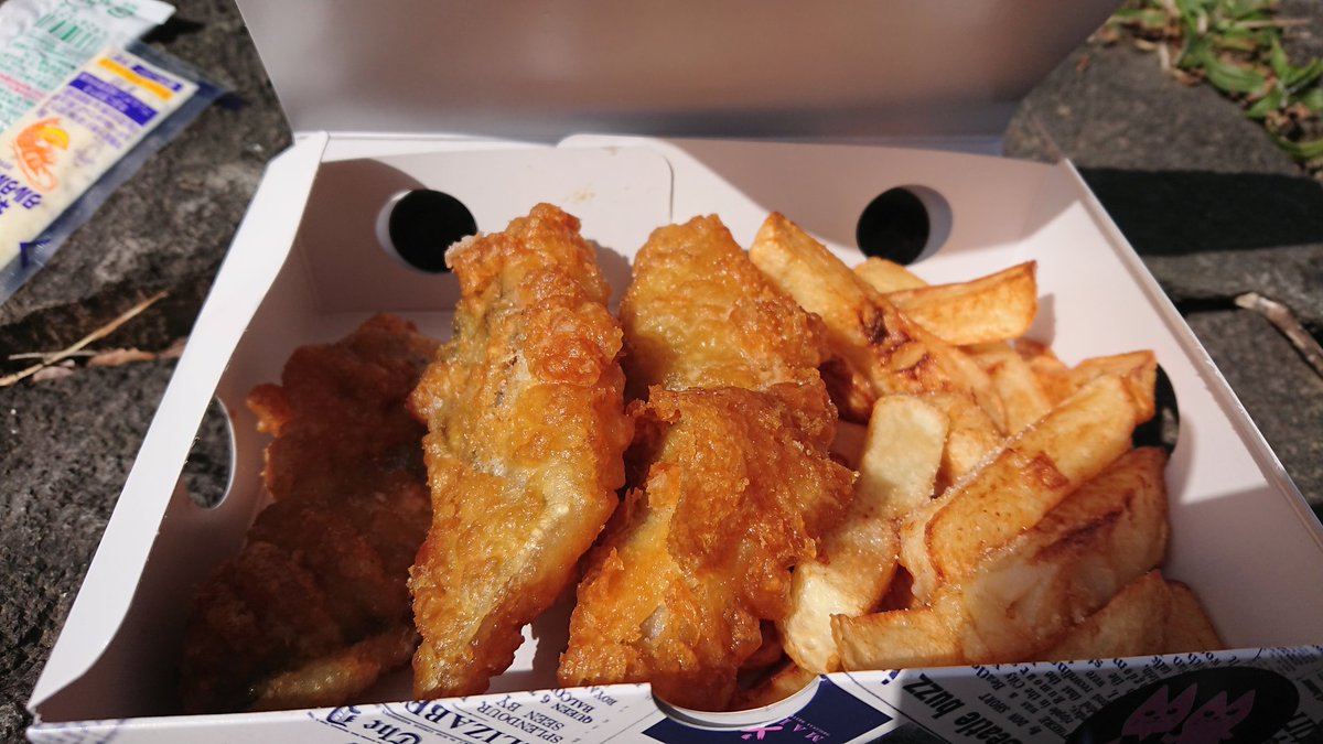 フィッシュアンドチップス・マリンのレギュラー(1200円)。同じ魚の揚げものでも、天ぷらのサックリ、アジフライのパリッとは異なる、衣のふわふわ感。いつ食べても不思議だ。 #代々木公園 #アイルランドフェスティバル #フィッシュアンドチップスマリン pic.twitter.com/cj4wjdwesE