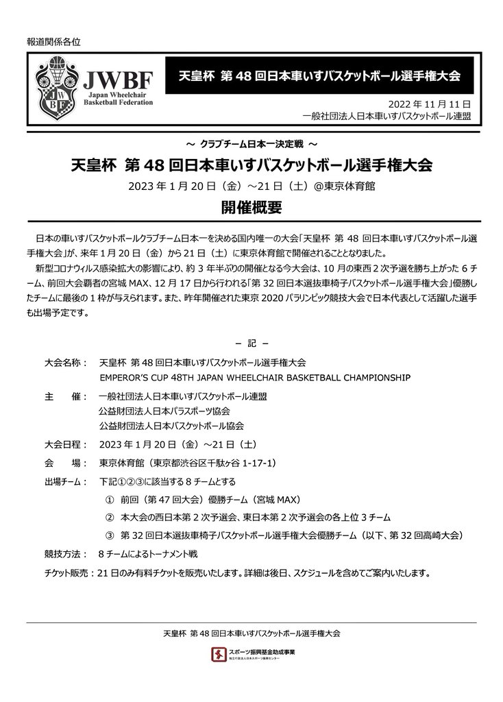 【リリース】天皇杯 第48回日本車いすバスケットボール選手権大会 開催概要
