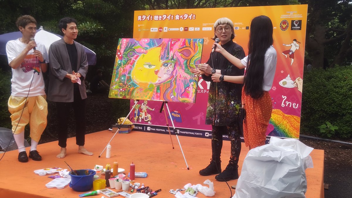 今日の午後は、MindaRynさんのアルバムジャケットを描いたMITSUMEさんが、タイ人アーティストの方とコラボしてライブペインティングを行うというので、ミニステージに見に行ってきました。この会場で面白いことが起こったのですが、それについてはまたいずれ。