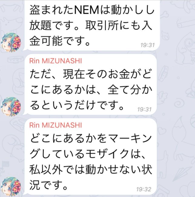 =>みなりん氏「盗まれたNEMは動かし放題です。取引所にも入金可能です。ただ、現在そのお金がどこにあるかは、全て分かるというだけです。どこにあるかをマーキングしているモザイクは、私以外では動かせない状況です。」 pic.twitter.com/DEbvNuAfLt