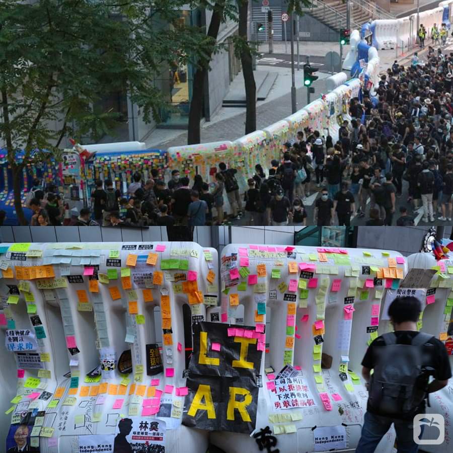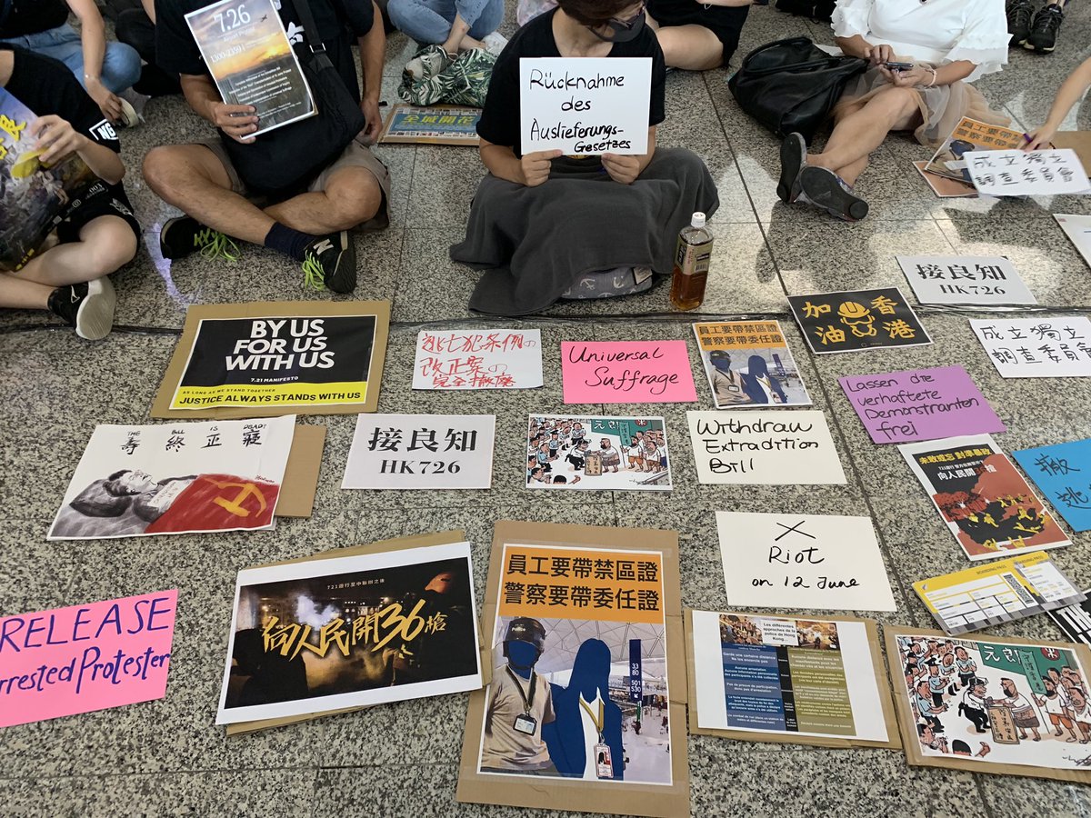 Protest signs include “tourist warning: the Hong Kong government deploys excessive violence” and “picking up: conscience, HK726” pic.twitter.com/095NaSkbiZ