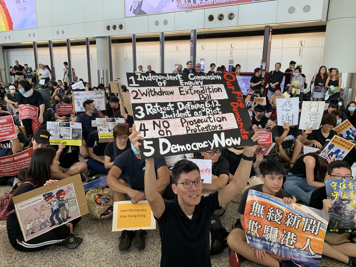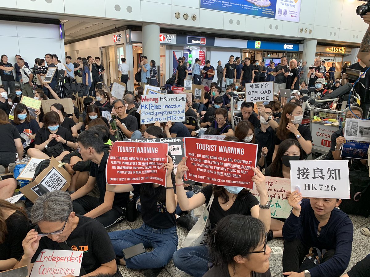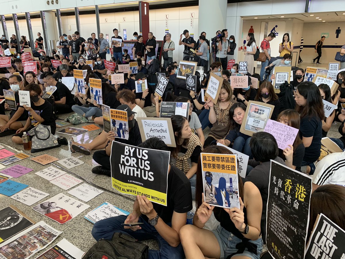 Happening right now: sit-in protest organized by aviation workers at the Hong Kong International Airport’s arrivals hall.