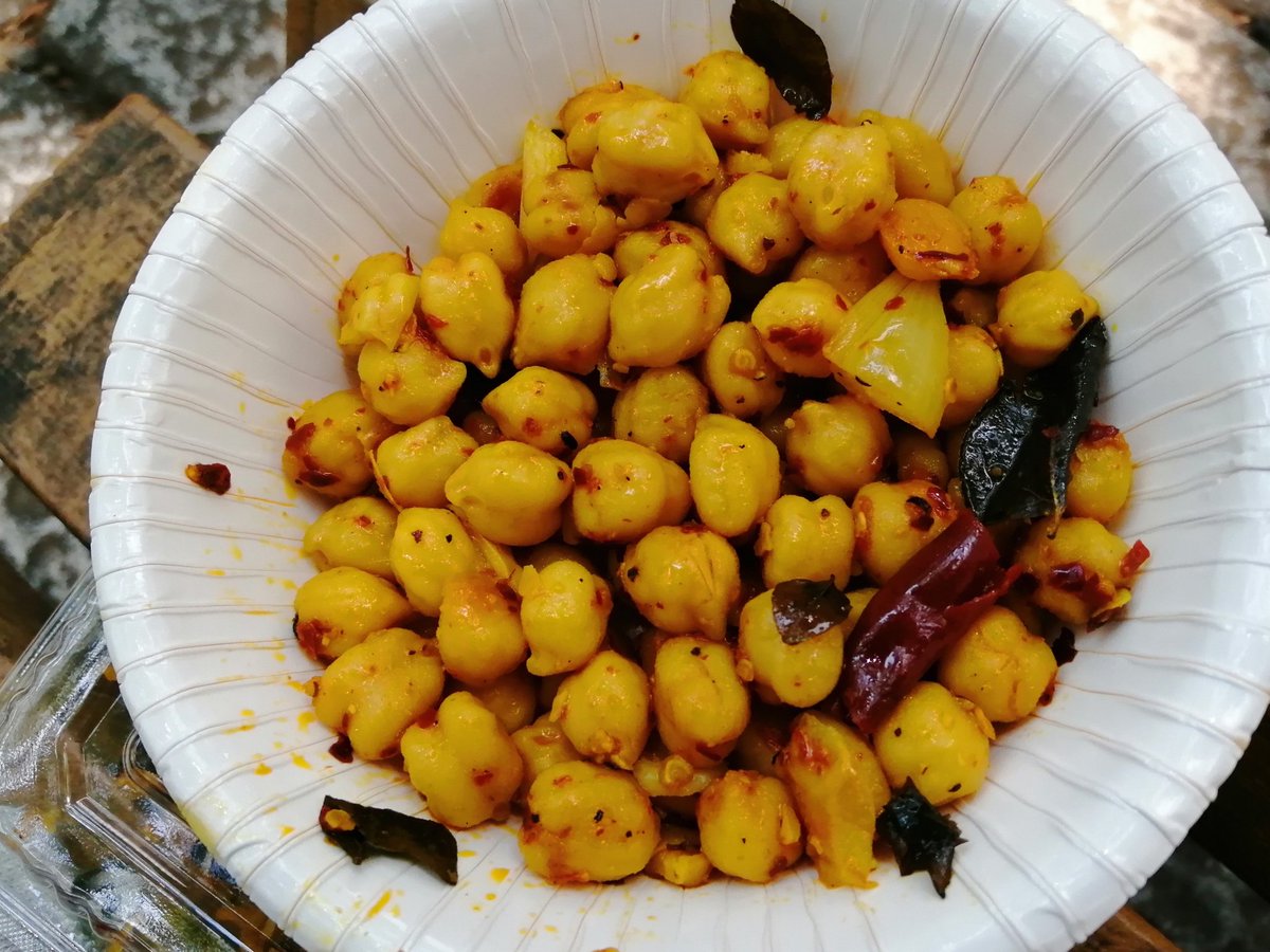 チッピーズというひよこ豆の炒め物を買ってみました❗バナナリーフで300円❗ 豆とスパイスだけのシンプルな味付けで美味い✨コットゥロティと合うわ~☺️ 今日はタッパーを持ってきたので、残りは家でいただきます🍴🙏