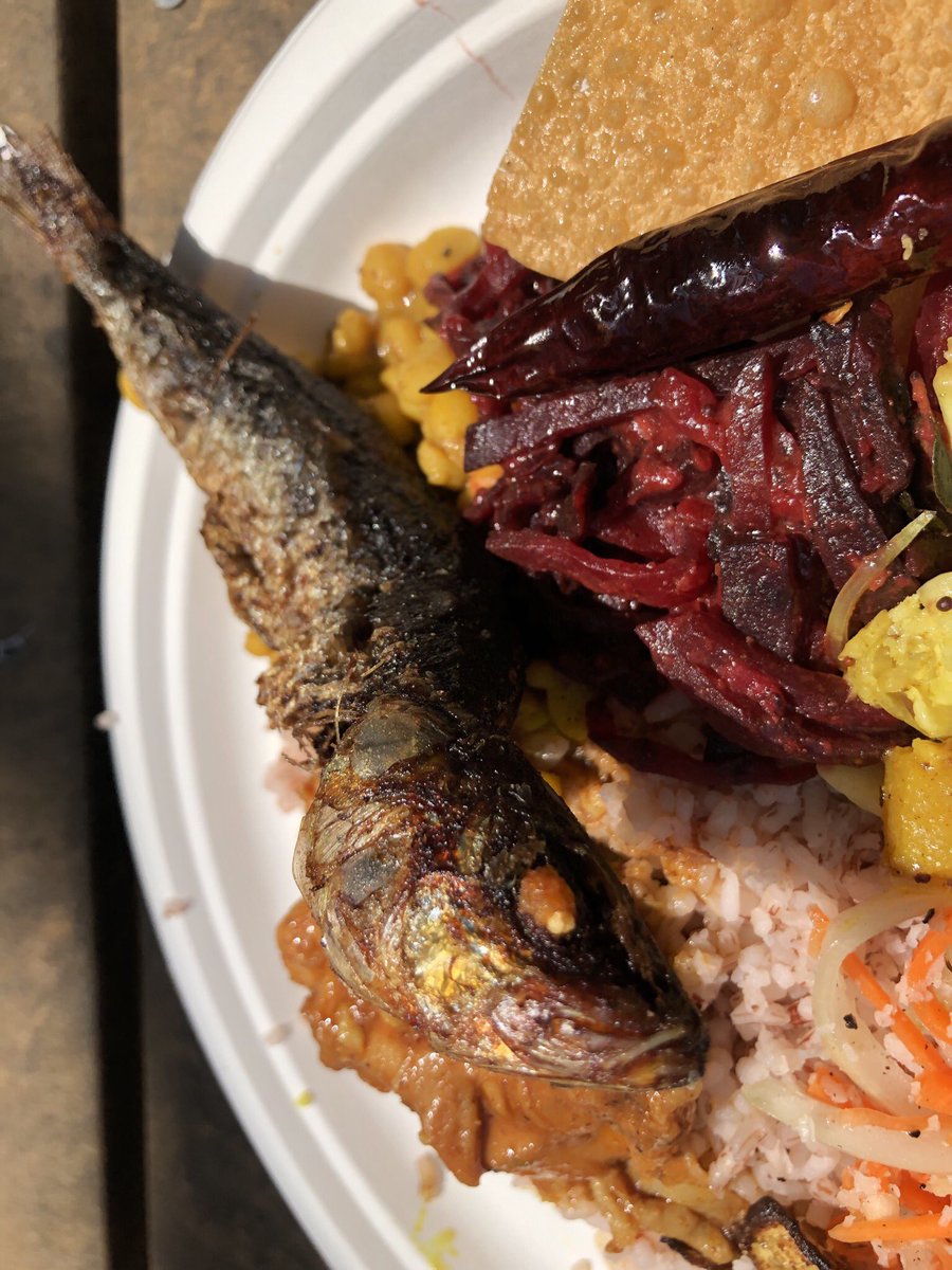 褐色のソースのようなスリランカン魚カレー佃煮がとってもスリランカ感を醸し出しています。スリランカの魚カレーはスパイシーさがあってこそ。