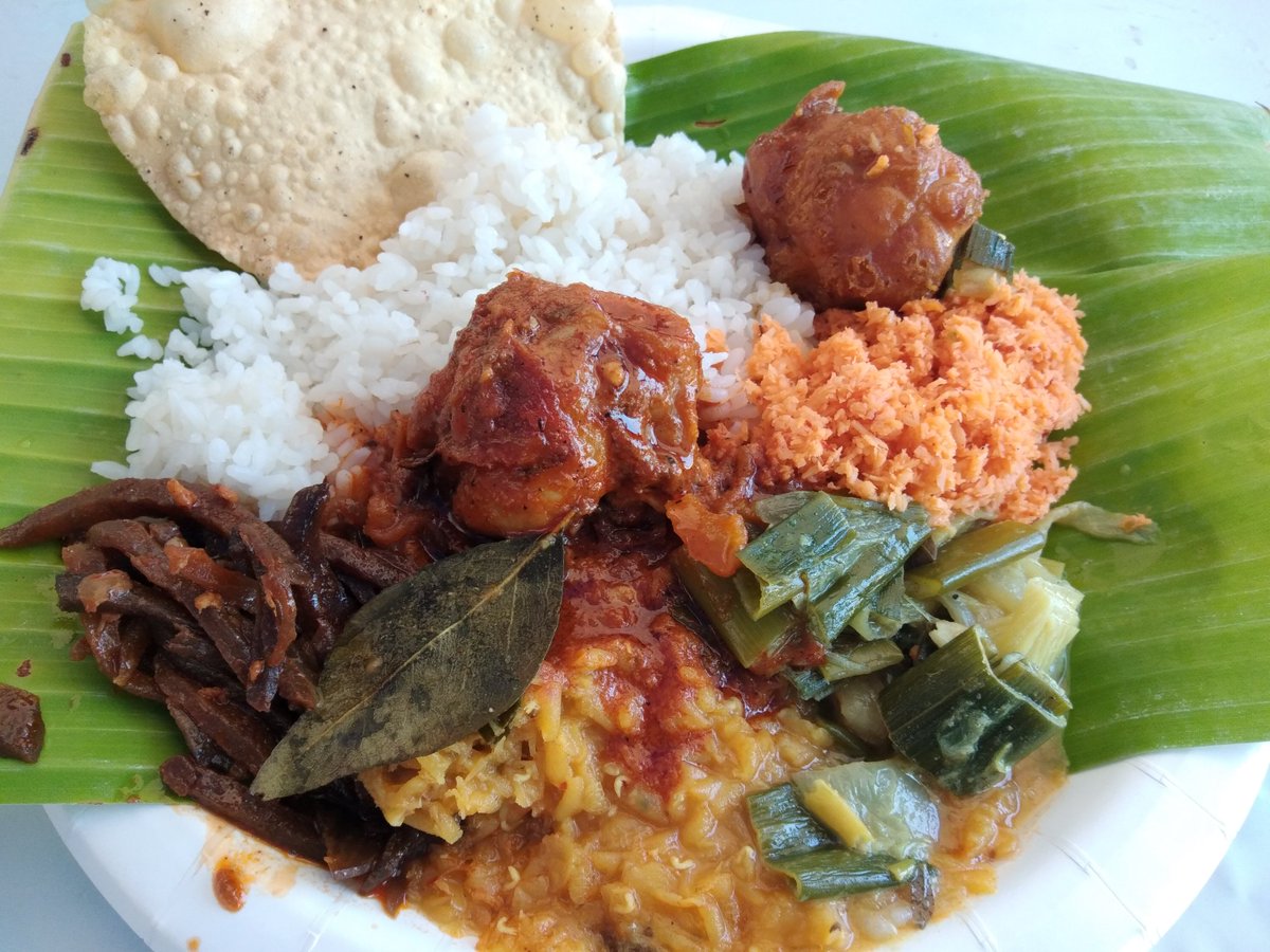 たまご、ポルサンボル、ネギ、豆、ビーツ、チキン、パパダム、ライス。