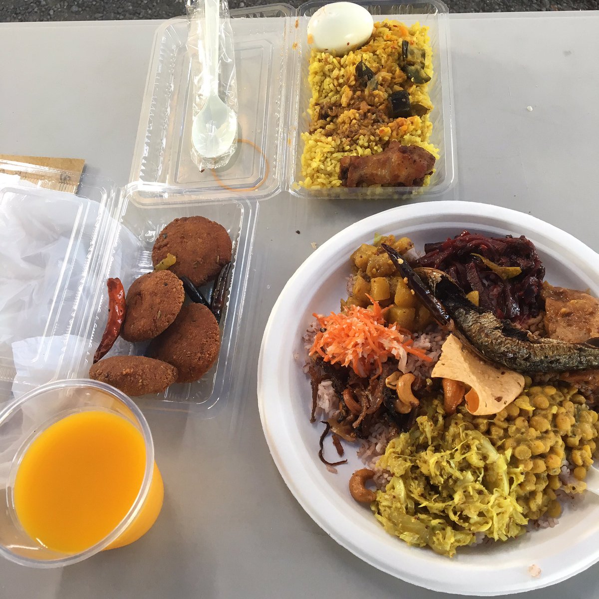 昨日の夕食、スリランカフェスティバル食べ収め。ホットスパイシーさんのカレービュッフェとバナナリーフさんのビリヤニとザ・ビレッジさんのパリップワダとマンゴージュース。 pic.twitter.com/MAyNbIml1n