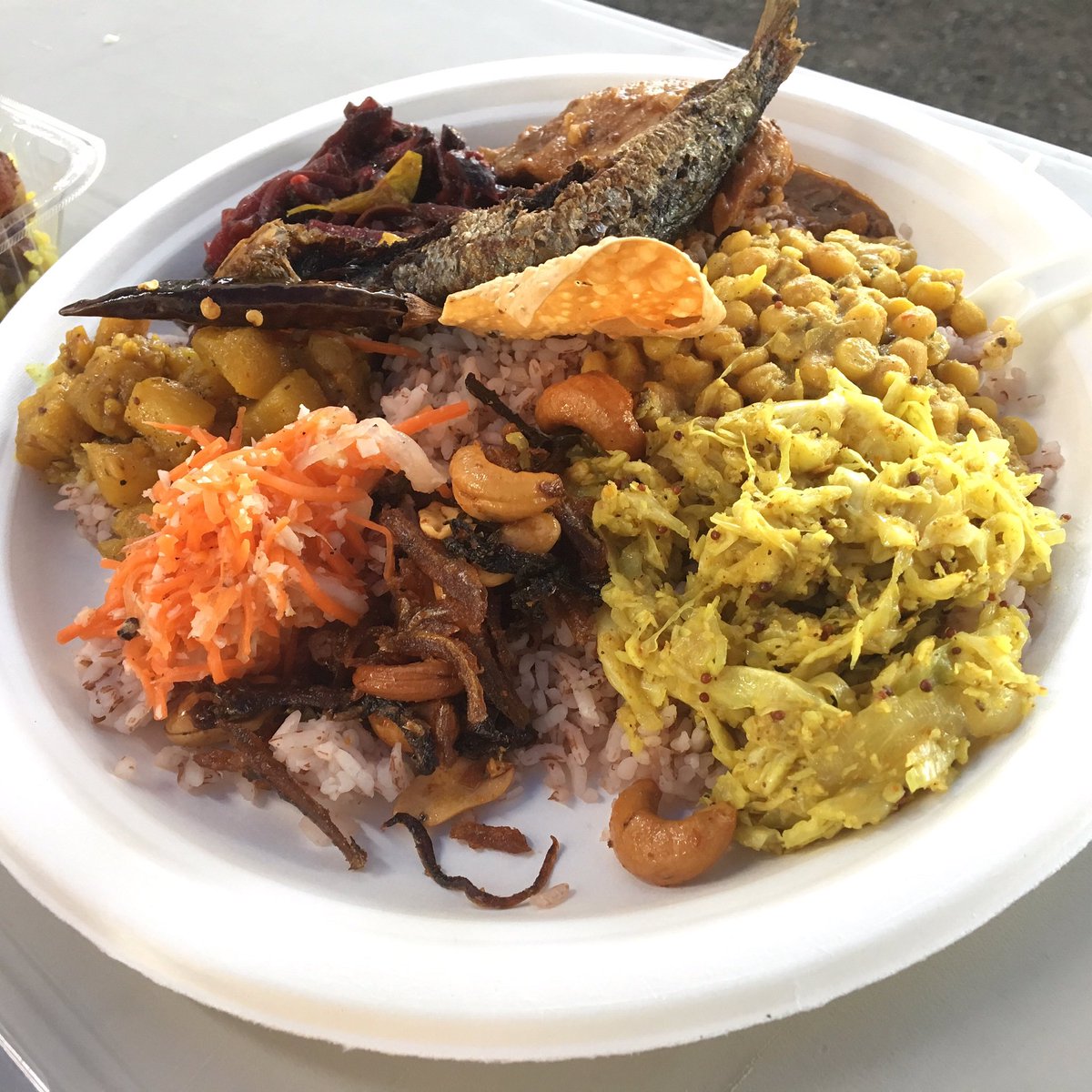 ホットスパイシーさんのカレービュッフェは、ずっしり盛られてて800円とコスパが良いのと具材の豊富さと人を選ばない味だと思うので万人におすすめ。お米は白米と赤米で選べます。上に乗ってるお魚がこれまた美味しく見た目の割に食べやすい。頭から尻尾まで残さず食べられます。来年もあってほしい! pic.twitter.com/eG7aLHs5ly