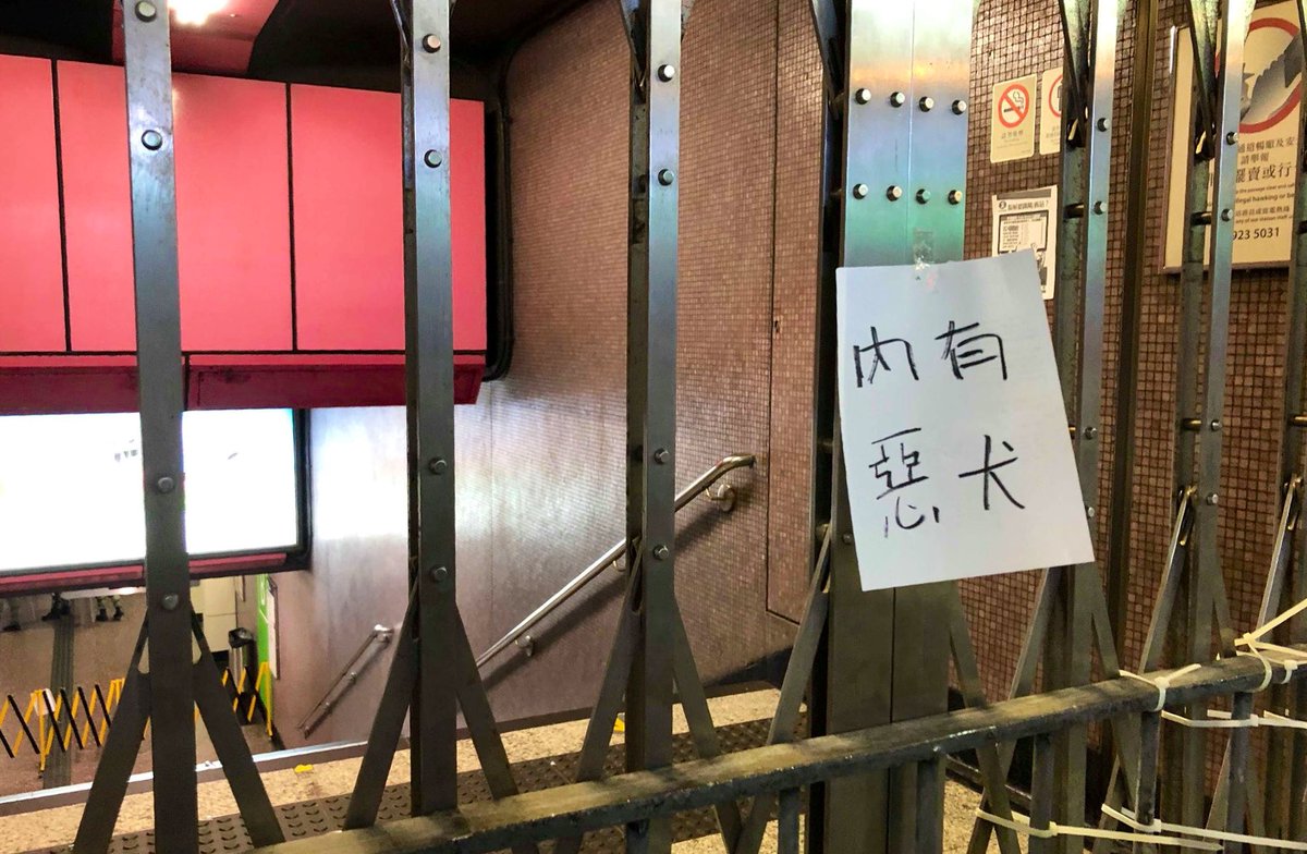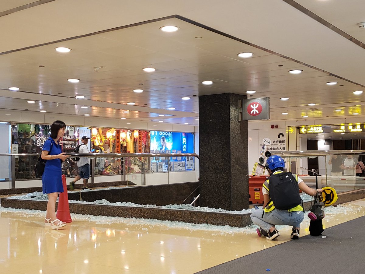Another tough day for MTR. Admiralty Station entrances are heavily vandalized, with steel-glass safety wall smashed down and gates blocked from outside. Protesters even wrote "Party Rail" 黨鐵 in simplified Chinese to criticize the railway operator. pic.twitter.com/Fh6r22ke18