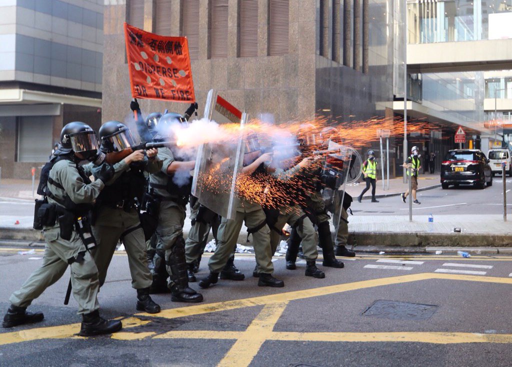 At dusk Aunday, riot police pushed through Harcourt Road with water cannon and tear gas. Protesters fled towards Wan Chai.