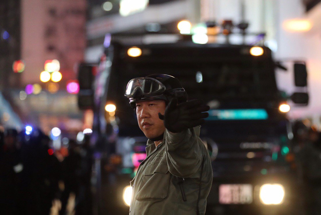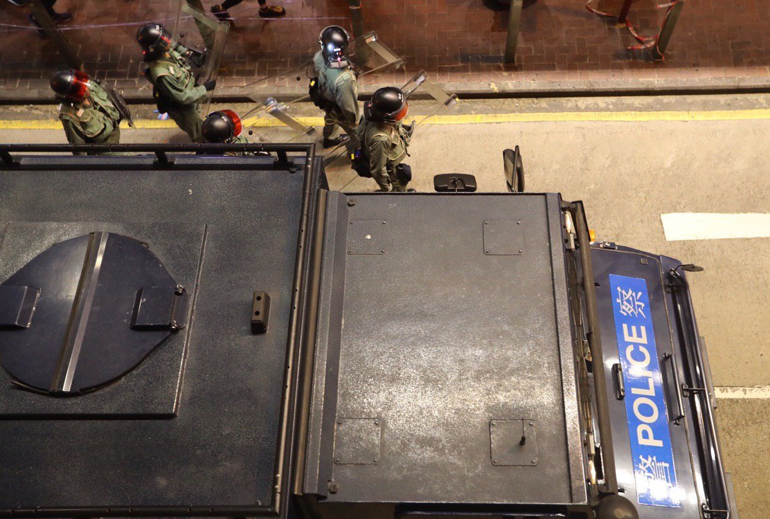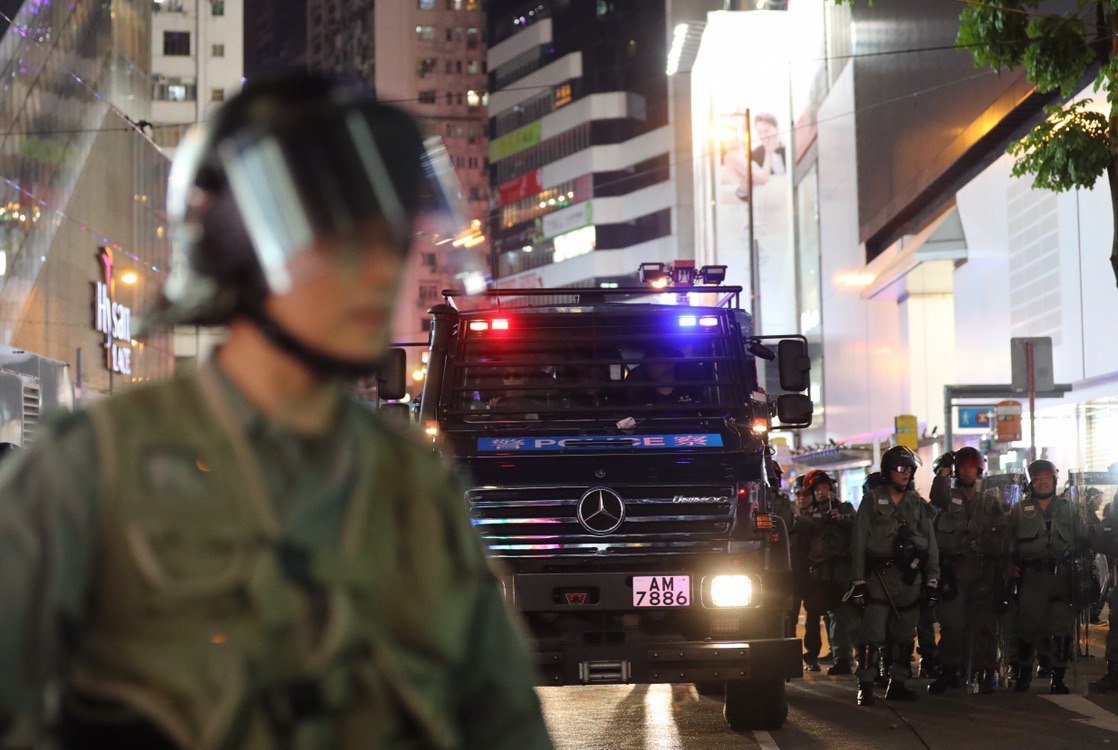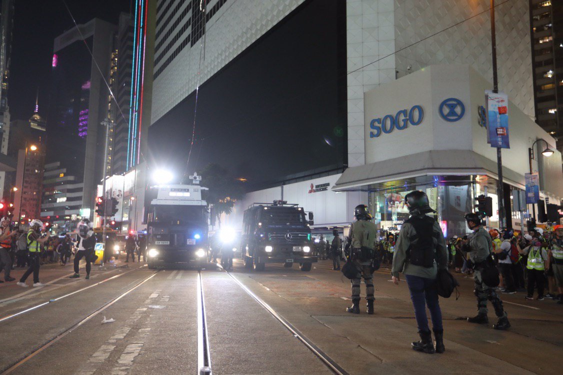 Police and their armoured vehicles are back out on the streets of Causeway Bay at 8pm.