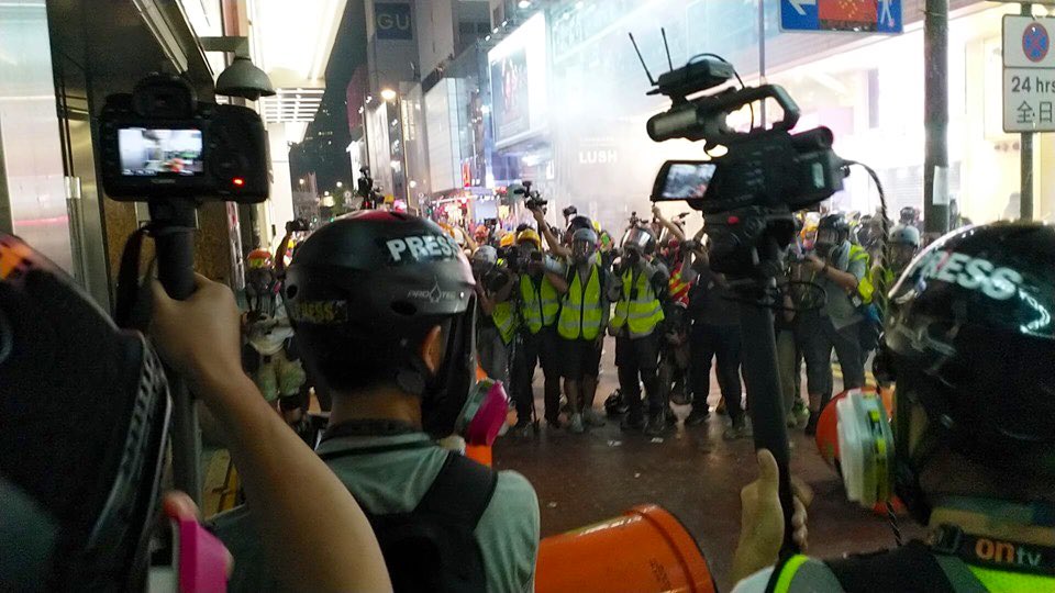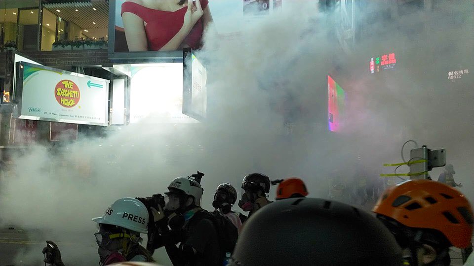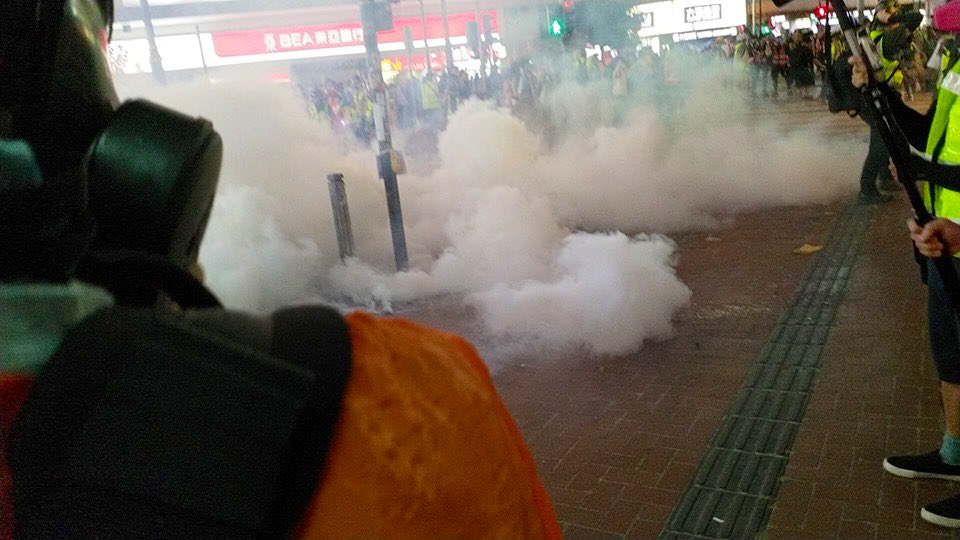 Police brandishing orange flag and warning of opening fire from behind the metal gate of Causeway Bay MTR exit to Great George St. Just bunches of journos here and barely any protester. Journos on the scene said the tear gas just now was fired by these police. pic.twitter.com/csIzfrvs1i