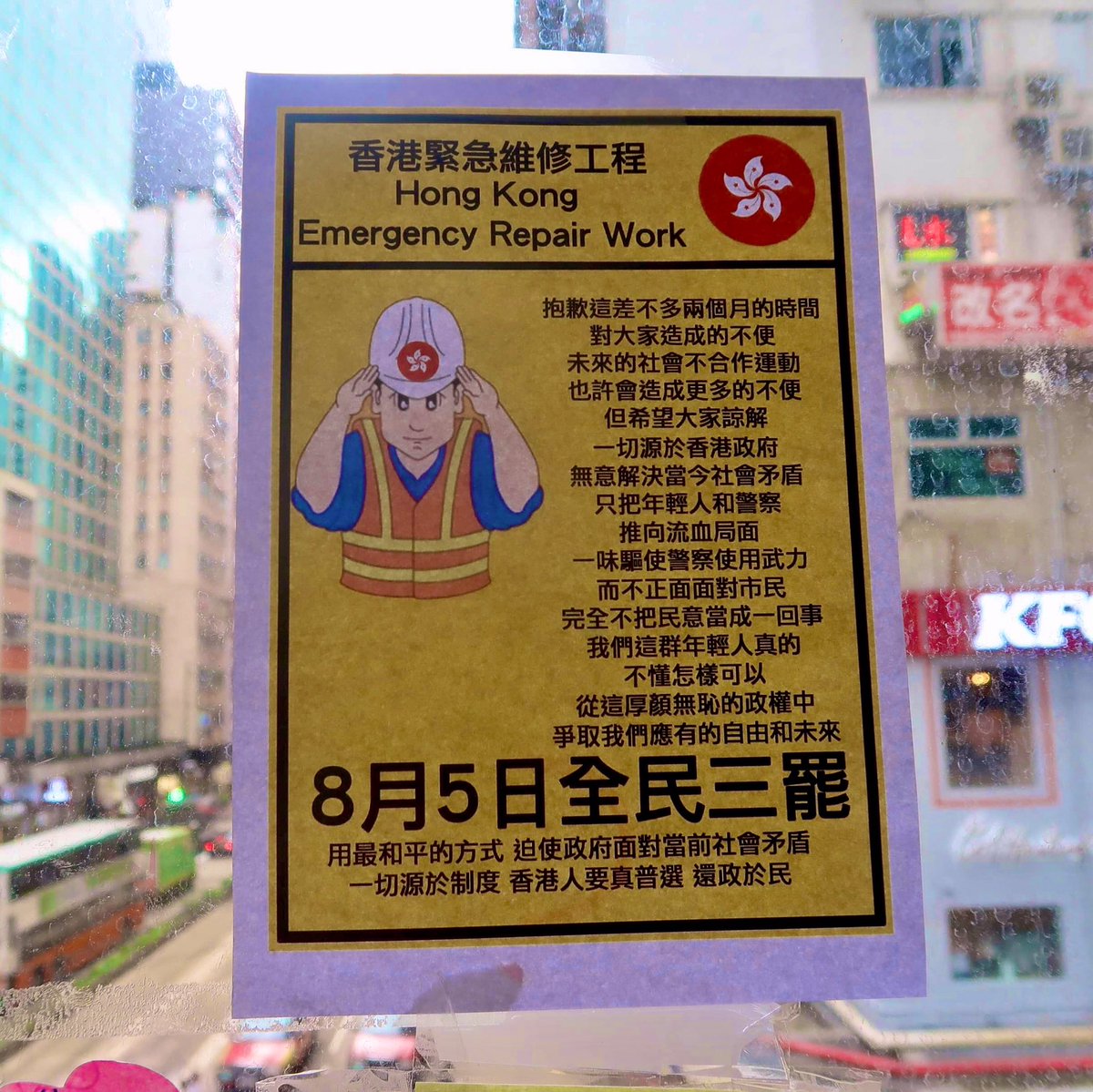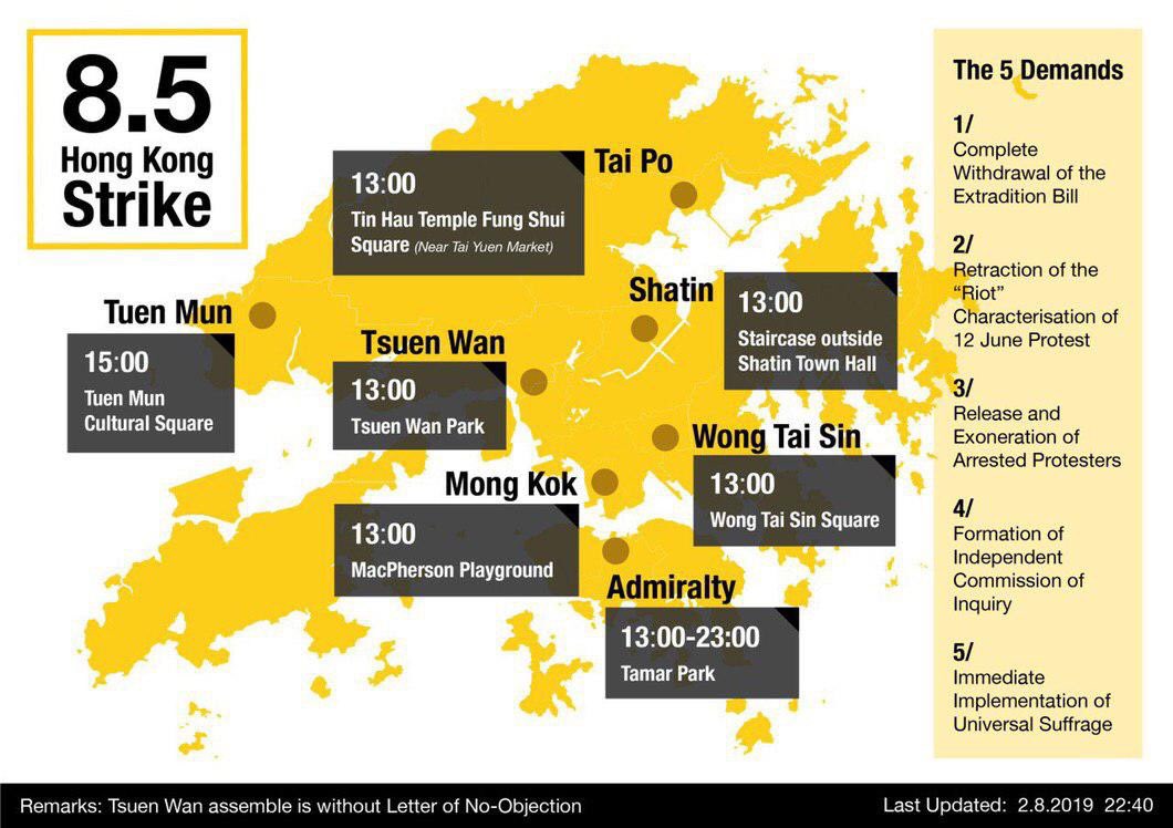 全香港大ストライキ及び7地区(中心部は金鐘・旺角・黄大仙、郊外は沙田・大埔・荃灣・屯門)同時抗議集会。4日時点で荃灣以外は全て警察の許可取得済み。