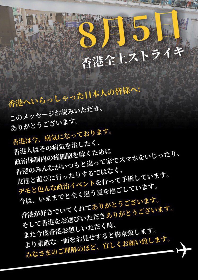 香港人は戦っているが、旅客の安全まで確保する余裕がないかもしれないので、安全の為にしばらく来ないでください。 pic.twitter.com/YXUIt7Jil0