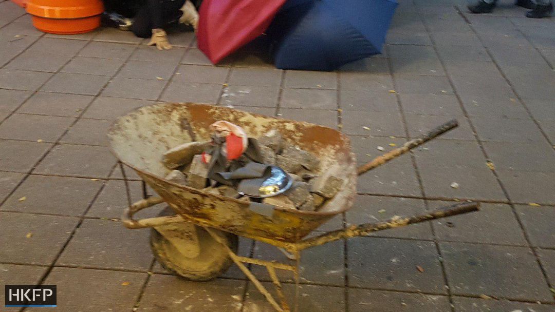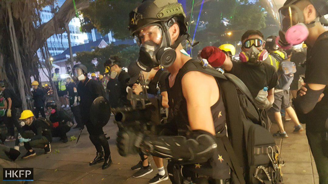 One protester was spotted by HKFP with a device to shoot projectiles into into the Tsim Sha Tsui police station. A slingshot was also set up to throw bricks.