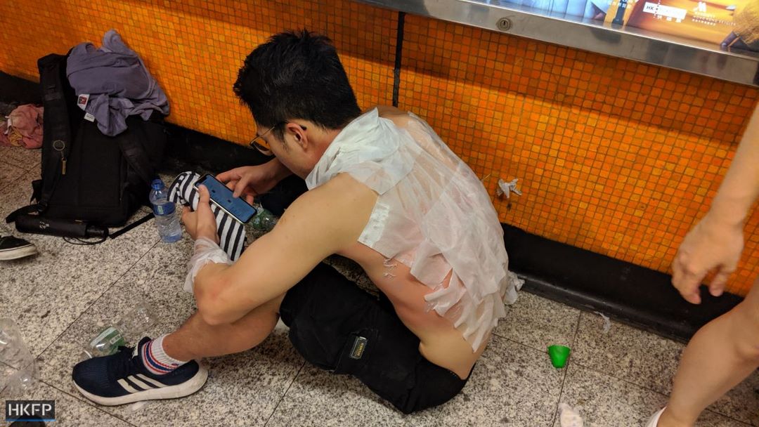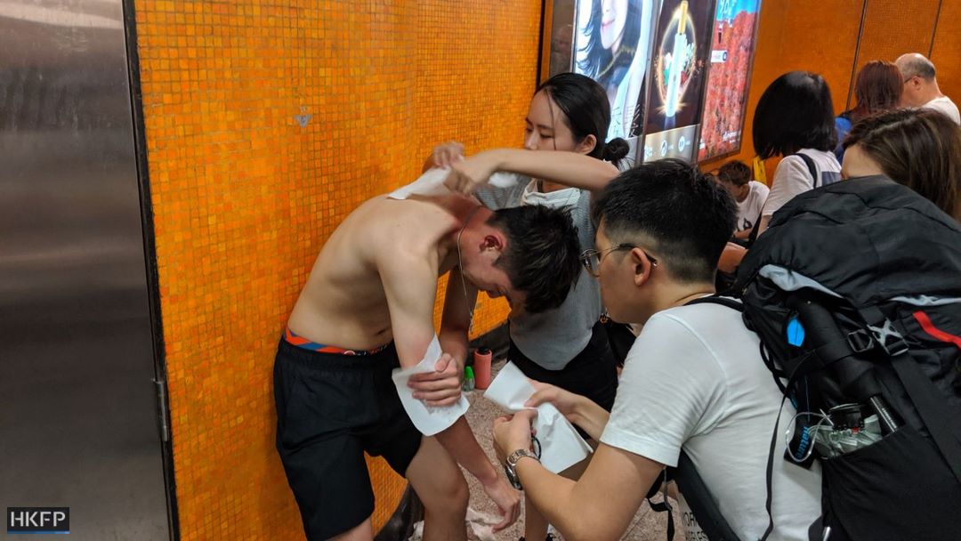 Protesters who were earlier pepper sprayed receive medical treatment at an exit for Sai Wan Ho's MTR station. #hongkongprotests #china #antiELAB #hongkong hongkongfp.com/hong-kong-extr… pic.twitter.com/vjpcWzamQL