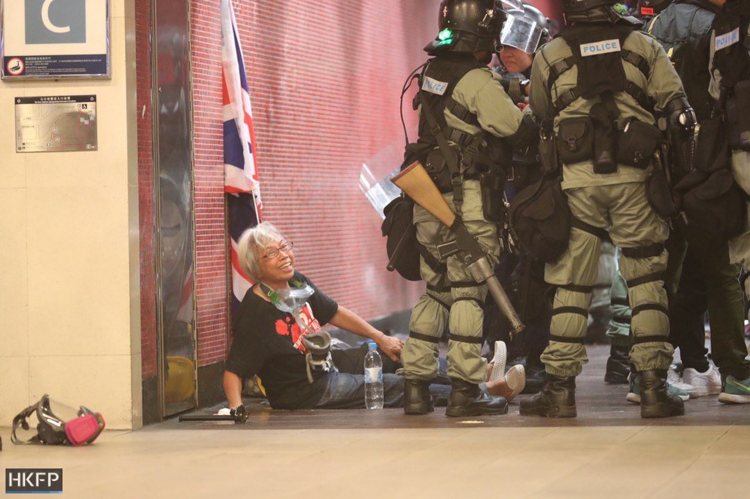 Grandma Wong, a regular at protests, is sat on the floor of an entrance to Tai Koo MTR station, where at least half a dozen protesters have been arrested by police. It is unclear whether she has also been arrested.