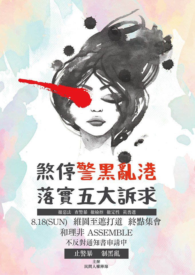 Civil Human Rights Front calls for a march on August 18, from Victoria Park in Causeway Bay to Chater Garden in Central. Application for police LONO submitted yesterday by deputy convener Figo Chan. #AntiELAB pic.twitter.com/CTm0BmhfW2