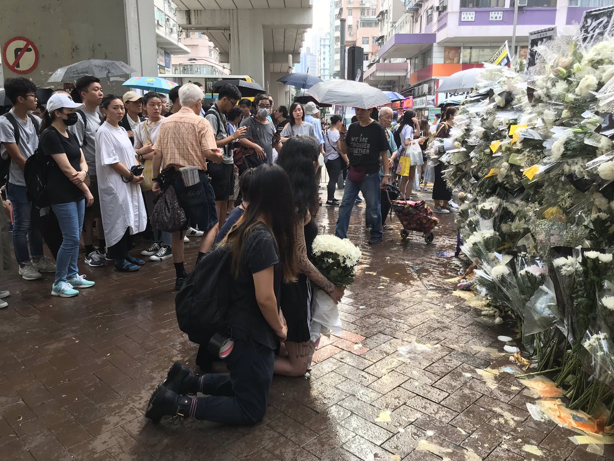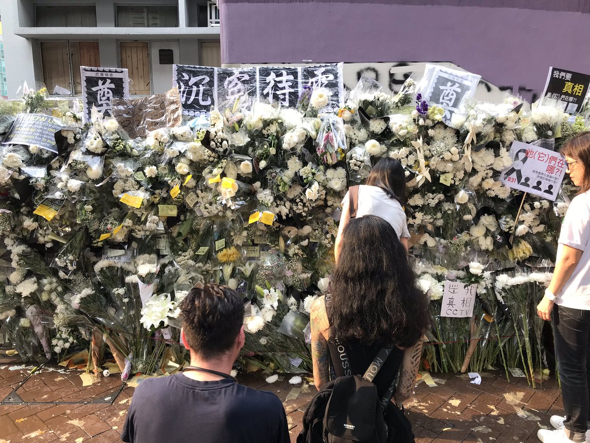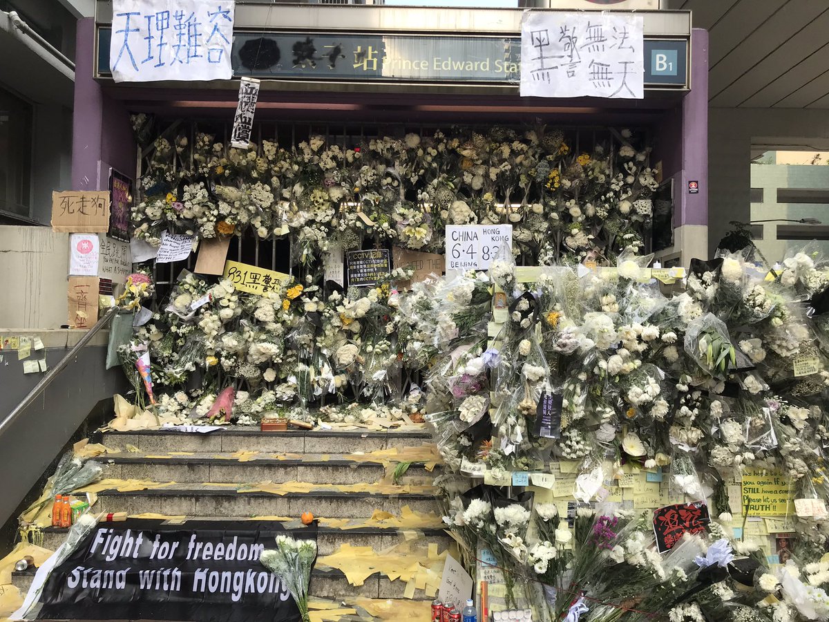 Live from Prince Edward - As the MTR station is closed, here’s a view of the makeshift memorial established by Hong Kongers. The whole B1 Exit is now covered by white flowers and all kinds of banners asking for truth. Quite a scene. #AntiELABhk pic.twitter.com/YfYLa2criY