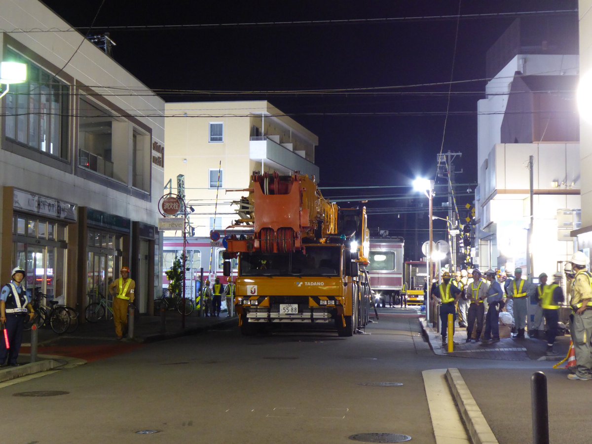 前から少なくとも3両は脱線、先頭は45°程傾いています