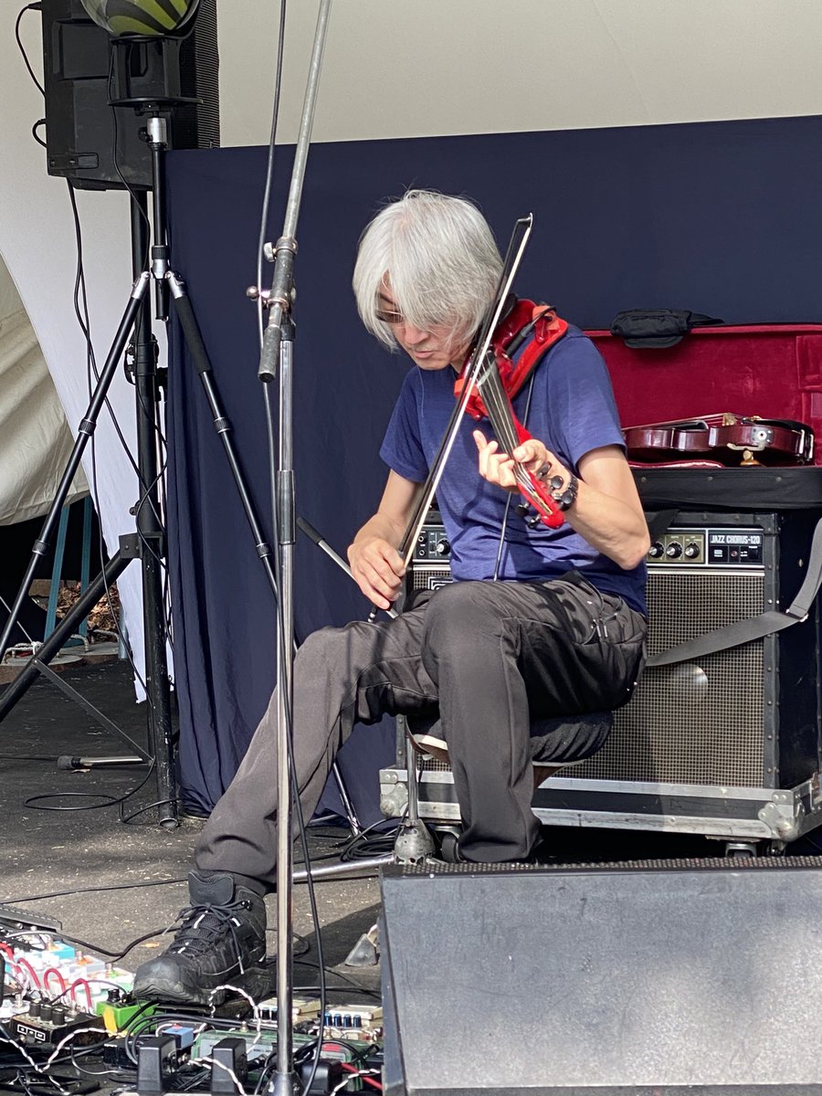 ルーパー・エフェクターでベースの音を作り、それに即興で演奏を重ねる。勝井ワールド全開!