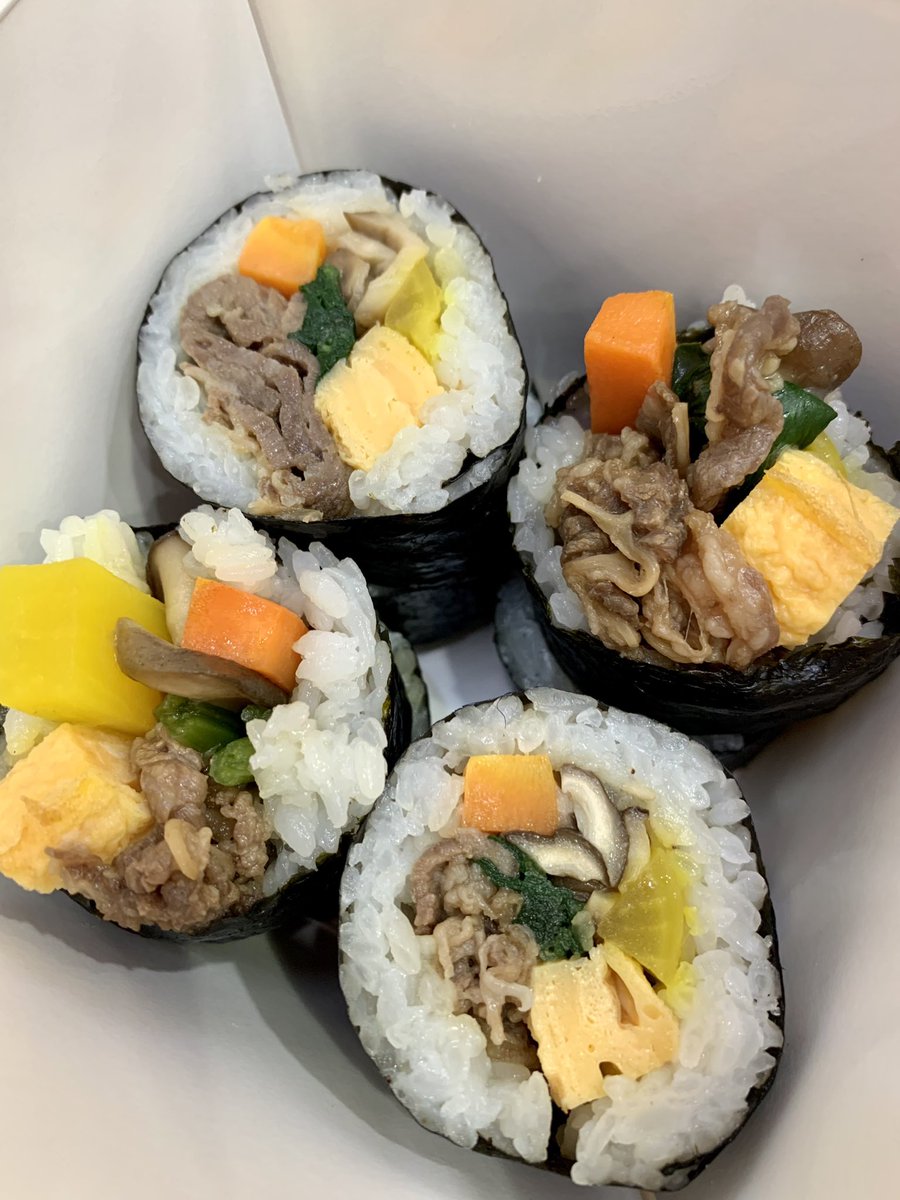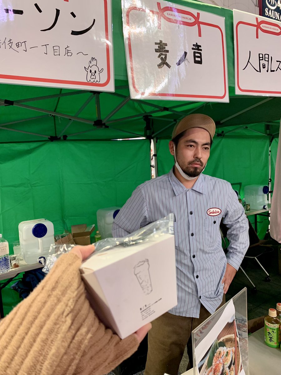 歌舞伎超祭おわり、会場に屋台を出してた麦の音(@mugino_oto )さんのオニイサンにジャンケンで勝利し、ちかたぬキンパをいただくの巻ー‼︎キャッホウあっしたっのあっさごっはんー‼︎🥰❤️✨