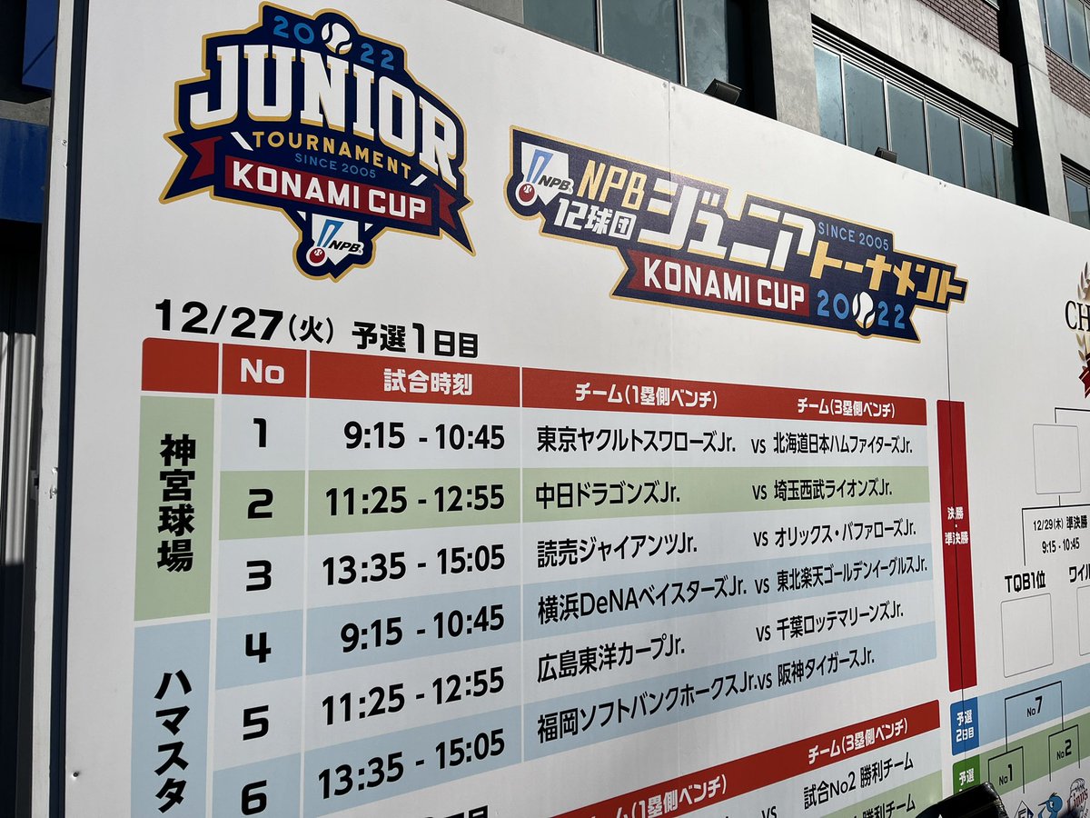 【NPB12球団ジュニアトーナメント KONAMI CUP 2022 試合予定(12/27)第1日】