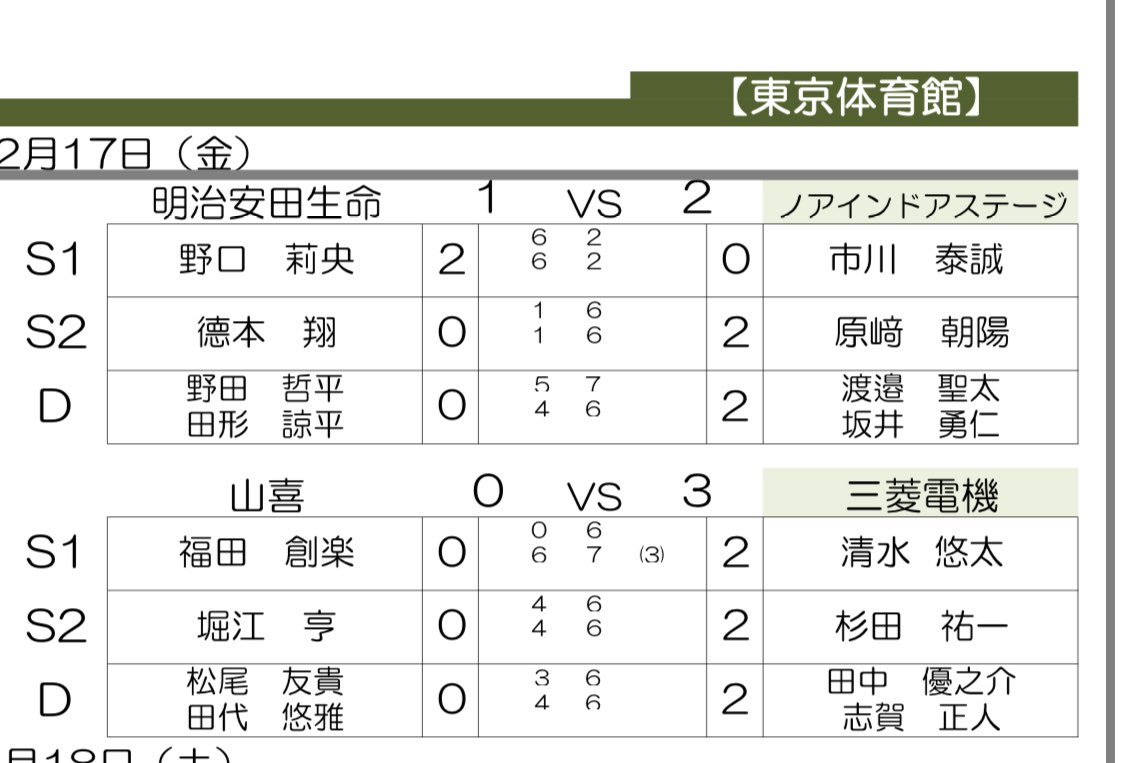 また男子 ノアインドアステージが明治安田生命を2勝1敗で破り、